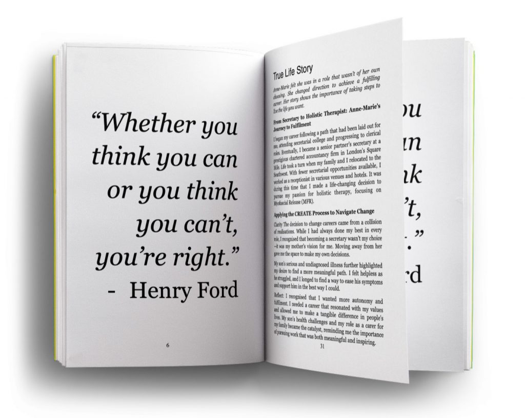 Review TextI read this captivating book at the start of my own exciting career change journey. I found it to be insightful, with fantastic real-life relatable accounts of a variety of individuals offering their own unique reflections on how small steps and using the C.R.E.A.T.E. Methodâ„¢ can be applied to effect fundamental and substantial changes in not only your personal life, but also throughout your career. This book not only resonated with me on a professional level but has inspired actual change in my personal habits, for the better too! The way Sarah's empathy, positivity and determination shines through her self-help sections at the end of each chapter challenges even the loudest inner voices of doubt and fear into submission. Full of honest and touching testimonials and inspirational quotes, this fabulous book is a must read for anyone looking to implement personal or professional steps to open your thinking to positive change for the future. An ambitious and aspirational MUST READ for budding entrepreneurs!